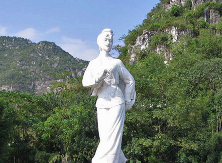 廣西宜山壯族傳說(shuō),劉三姐生于唐中宗神龍?jiān)辏?03年),從小聰慧過(guò)人,能歌善唱,被視為"神女"。12歲即出口成章,妙語(yǔ)連珠,以歌代言,名揚(yáng)壯鄉(xiāng)。后曾到附近各地傳歌。慕名前來(lái)與她對(duì)歌的人絡(luò)繹不絕,但短則一日,長(zhǎng)則三五天,個(gè)個(gè)罄腹結(jié)舌,無(wú)歌相對(duì),無(wú)言以答,羞赧而退。然而她的才華卻遭到流氓惡霸的嫉恨,后被害死于柳州。傳說(shuō)她死后騎鯉魚上天成了仙。也有的說(shuō)她在貴縣的西山與白鶴少年對(duì)歌七日化而為石。還有的說(shuō)財(cái)主莫懷仁欲娶她為妾,三姐堅(jiān)決反抗,莫買通官府迫害三姐,三姐乘船飄然而去,等等。