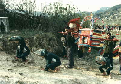 每當農歷正月初一黎明,人們就敲著銅鼓成群結隊去田里找冬眠的青蛙。據說,先找到青蛙的人是幸運的,被譽為雷王的女婿“螞拐郎”,成為該年螞拐的首領。首領要帶著大家點燃煙炮,以向雷王報告人間祭螞拐的喜訊。人們把這只青蛙接回村,放入花轎中。由初一到正月底,白天孩子們抬著青蛙游村,向每家每戶賀喜;晚上,則抬到螞拐停下,人們跳螞拐舞和唱螞拐歌,以示為螞拐守靈。守靈、游村的活動進行到第25天后,螞拐節便進入高潮。這天,人們選擇吉時,抬著花轎到青蛙下葬的地方,打開去年葬蛙的寶棺,如果青蛙的骨頭呈金黃色,便預示今年是好年景,全場頓時銅鼓齊名,同聲歡呼。如果蛙骨呈灰色或黑色,便表示年景不好,于是人們就燒香祈求消災降福。接著舉行新青蛙的的下葬儀式。葬禮之后,男女老少一起圍著篝火唱歌舞蹈,送螞拐的靈魂上天。這一夜,人們盡情狂歡,通宵達旦。(圖片及部分文字資料來自中國非物質文化遺產網)