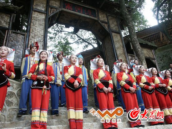 施曉亮9年前拍的照片,下枧河畔,壯族姑娘小伙在寨門唱歌迎賓。(施曉亮 攝)