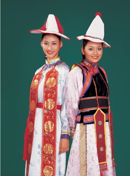 婦女一般頭戴喇叭形白色氈帽,或紅纓帽,前緣鑲有兩道黑邊,帽頂綴有紅線穗子,后緣微翹,前沿平伸;身著高領長袍,外套坎肩;衣領、袖口、襟邊用各色絲線繡有花邊圖案。婦女所戴的尖頂紅纓氈帽和佩帶色彩鮮艷的“頭面”具有其典型的民族特性,二者也是裕固族已婚婦女的特殊的服飾。裕固族未婚女性則有她們特殊的服飾,即戴在頭上額前的“沙達爾格”、佩帶在胸前的一塊“順格爾”和背后的“格玉孜克”。未婚女子常梳五條或七條發(fā)辮;結(jié)婚后,先把頭發(fā)辮成許多小辮,然后結(jié)成三條大辮,兩條垂胸前,一條垂背后,辮子上綴以彩珠、銀牌、珊瑚、貝殼等飾物。