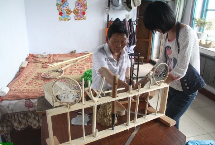 我們有幸接觸到赫哲老藝人孫玉林伯伯,他是從2000年就開始做魚皮衣了,在2005年申請到了省級非物質文化傳承人,聽他給我們講做一套魚皮衣就要用十多斤的大馬哈魚七八十條,而每年大馬哈魚群又只是在9月中旬的時候出現一次,因此格外珍貴,價格也不菲,一套魚皮衣要上萬元,現在作為一種工藝品也是受到很多游客的青睞。而在以前由于沒有布料所以人們就用打來的大魚剝下皮來做衣服(不過這里我很是疑問,冬天穿魚皮衣沒布的話那魚皮衣里面要套些什么的好啊)。魚皮一直以來給我的感覺都是軟軟的柔柔的,一戳就破,以至孫伯給我們展示魚皮衣的時候摸它都不敢用力,可孫伯告訴我們,大馬哈魚皮真正的拉力是牛皮拉力的七倍左右,很有韌性。以前人們冬天穿的魚皮鞋很單薄,冬天穿著顯然是冷,于是就把里面塞上些打成棉花樣的靰鞡草,一雙鞋穿上四五冬一點問題都沒有。而做衣服余下的邊角料就可以很創造性地做些小飾品,或專門用料做成一幅幅精致魚皮畫。