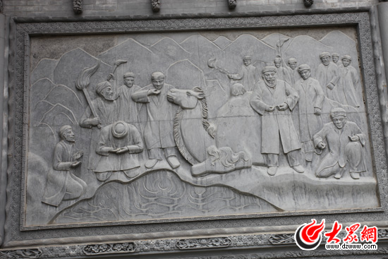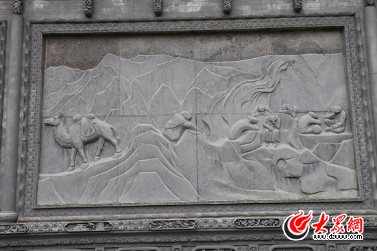 駱駝泉內(nèi)最醒目的是一面長約40米的石雕墻,由八塊石質(zhì)浮雕組成。為什么是八塊呢?韓占祥說:“一,撒拉族東遷歷史是八百年;二,撒拉在滿清有八宮,現(xiàn)在是八個鄉(xiāng)鎮(zhèn);三,街子有六門八戶;四,2008,中國實現(xiàn)了百年奧運夢想;五,中國人最喜歡阿拉伯?dāng)?shù)字8,因此我用8塊浮雕表現(xiàn)撒拉族東遷史。”