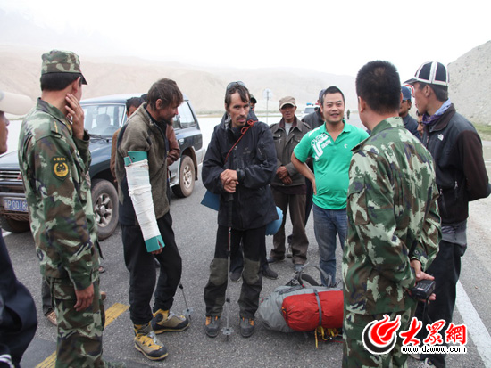 兩個來慕士塔格峰登山的老外,其中一個摔傷了,傷勢有些嚴重,胳膊骨折三處,腿也傷了。他們想從山腰間徒步走過去,山那邊有醫療救護車來接他去喀什。但邊防官兵考慮到風大山體滑坡危險,勸阻他先到塔縣救治,等水退了后再轉到喀什。
