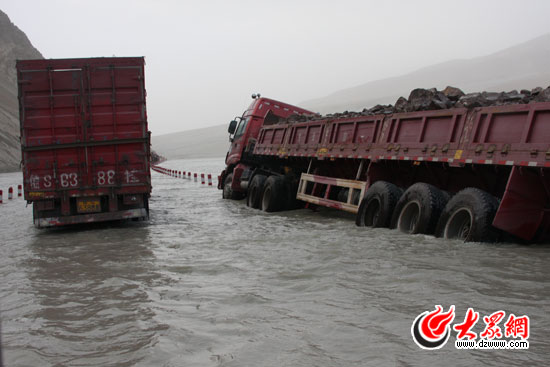 昨天采訪團接到邊防公安派出所山東老鄉路通電話,趕到前幾天水毀路段時,已經是20:30分。經過5天的緊急搶修,此時堰塞湖的水位緩慢消退到高底盤的大卡車勉強可以通過的程度。有著豐富自駕遠行經歷的領隊施曉亮與20多年駕齡的王偉商量后,決定跟著一隊大貨車涉水。但一下水二位自駕高手就有點后悔了:水淹路面完全與湖面混為一體,行車其上仿佛湖面行舟,有幾輛大貨車因為看不到水下的柏油路面而開下泡軟的路基,等待救援。公羊車的底盤雖然不算低,但有一段100多米的路段水深沒過大貨車車輪的一半,淹沒我們公羊車車輪的大半,而公羊車尾的排氣管完全淹沒在水中。如果停止加油,就有水進入排氣管被"淹"息火的危險,而持續加油則會與前方小心翼翼行駛的大貨車追尾。