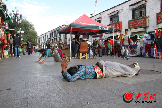 大眾網(wǎng)——聯(lián)通3G拉薩9月9日?qǐng)?bào)道(記者 王磊)進(jìn)藏前,就在網(wǎng)上聽(tīng)說(shuō)不管是文人墨客,還是遠(yuǎn)方游客,來(lái)到拉薩如果不去八廓街那將是一種遺憾。八廓街又稱(chēng)八角街,它是藏傳佛教信徒心中的“圣路”,又被稱(chēng)為拉薩的“王府井”。9月8日清晨,“黨旗漫卷中國(guó)紅——走進(jìn)56個(gè)民族家庭”接力式采訪團(tuán)在休整了一天后,前日強(qiáng)烈的高原反應(yīng)漸漸消退,我?guī)еd奮在八廓街上漫步,沿著這條拉薩最古老的轉(zhuǎn)經(jīng)道向大昭寺走去。