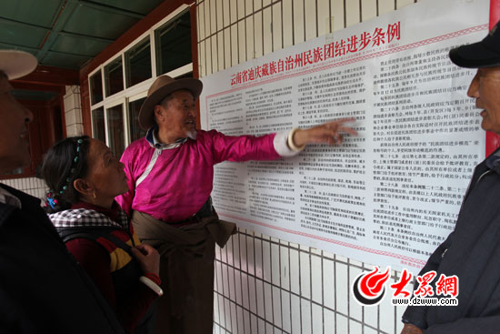 大眾網-聯通3G迪慶9月21日訊(記者 王磊)9月21日,“黨旗漫卷中國紅——走進56個民族家庭”大型接力式采訪團到達迪慶州,走進無數人夢想的地方——香格里拉。在香格里拉縣建唐鎮吾呂村,73歲的藏族鍋莊傳承人七林旺堆老人向我們講述了他與鍋莊的故事,并把一首自創的《心中的歌》獻給黨的90歲生日。七林旺堆還告訴我們,在香格里拉,鍋莊已經演變成為大家晚飯后的健身舞,不管男女老少每個人都能跳一段,大家在快樂中傳承,在傳承中獲得健康。