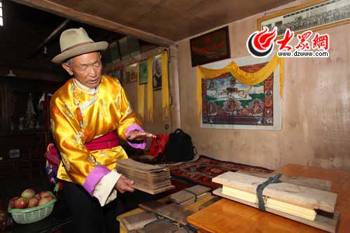 大眾網(wǎng)-聯(lián)通3G麗江9月29日訊(特派記者 王磊 特約記者 施曉亮)28日,“黨旗漫卷中國紅——走進(jìn)56個(gè)民族家庭”采訪團(tuán)離開瀘沽湖,來到麗江市下轄的寧蒗彝族自治縣。在81歲普米族德高望重的民族文化專家胡鏡明老人家中,我們不僅了解到了普米族鮮為人知的歷史,而且施曉亮也有意外收獲——他遍尋不見的十年前的采訪對(duì)象,都在胡老家中意外相遇:一位是十年前寧蒗縣新營盤鄉(xiāng)牛窩子村韓規(guī)文化學(xué)校從四川請(qǐng)來的韓規(guī)老師麥色偏初,另一位是十年前剛剛退休的縣民委副主任、韓規(guī)學(xué)校的發(fā)起人馬洪升,其實(shí)他們十年前就是與胡鏡明先生一起創(chuàng)辦韓規(guī)學(xué)校、致力于民族文化的保護(hù)。這十年來,以他們?yōu)槭椎氖畮讉(gè)普米族有識(shí)之士組成的普米文化保護(hù)中心,一直在竭盡全力進(jìn)行搶救韓規(guī)經(jīng)書、傳播普米文化的工作。這些老中青三結(jié)合的普米族精英,以民間的力量,或深入鄉(xiāng)間村寨收集即將消逝的經(jīng)文、或潛心整理普米語傳統(tǒng)民諺匯編成冊(cè),他們的努力最終得到政府的認(rèn)可和支持,縣民族小學(xué)特別開設(shè)了“普米班”。麥色偏初十年間教出的17名徒弟也像當(dāng)年的他一樣,正在教普米族的娃娃們普米文和本族的傳統(tǒng)習(xí)俗。