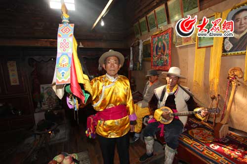 胡鏡明老人將寧蒗普米文化保護(hù)協(xié)會(huì)的幾位成員召集到自己家中,向記者展示普米族的傳統(tǒng)文化。胡老身后的這位彈唱普米傳統(tǒng)民歌的老人叫格桑次里,是位退休教師,現(xiàn)在也是”普米族傳統(tǒng)文化保護(hù)協(xié)會(huì)“的骨干