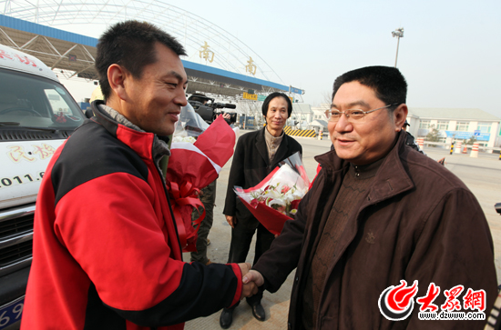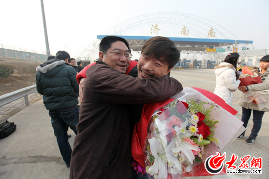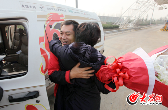 12月21日下午1:20,提前得知采訪團將凱旋消息的采訪團成員親朋及省、市級媒體記者30余人,早早地趕到繞城高速濟南南高速出口,他們懷抱著大束鮮花,不停向高速收費口方向張望著。