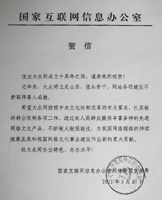 [提要]   值此大眾網成立十周年之際,謹表熱烈祝賀!近年來,大眾網立足山東,埋頭苦干,網站各項建設不斷取得喜人成就。希望大眾網按照中央文化體制改革的有關要求,扎實做好轉企改制各項工作,通過向人民群眾提供豐富多樣的先進網絡文化產品,不斷做大做強做優,為我國網絡媒體的持續健康發展和我國網絡文化事業建設作出新的更大貢獻