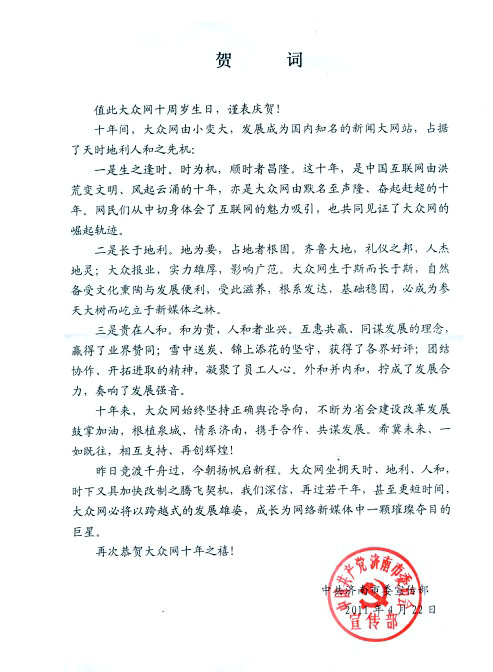 濟南市委宣傳部賀信
