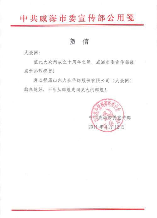 威海市委宣傳部賀信