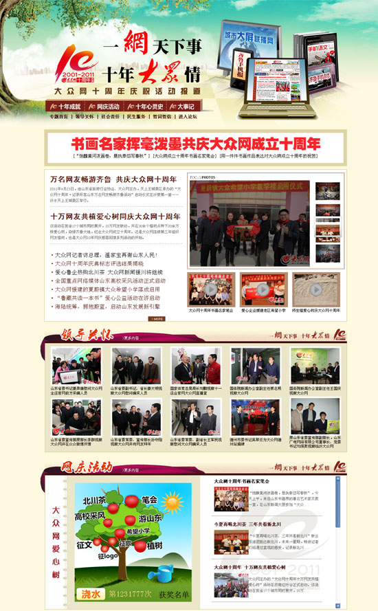 十年間,在山東省委、省政府和各相關部門以及大眾報業集團的大力支持下,大眾網已經成長為山東省最大的新聞網站,先后承辦了第十一屆全運會官方網站、齊魯文明網、山東宣講網、中國黃河三角洲網站等幾十個網站。