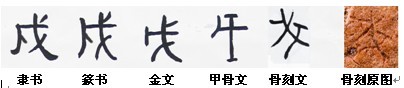 五、“枕戈以待”圖左側(cè)邊緣是一組刀槍斧鉞組成的圖案,這很象甲骨文和金文的“戍”字。“戍”字為獨立象物字,象兵器斧鉞之形,本義是斧。古音戍幽部、斧侯部,幽侯旁轉(zhuǎn)。《說文解字》中解釋:“戍,守邊也。伐者左人右戈,人持戈也。”