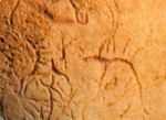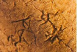 三、“顓頊師昊”圖 這組圖像位于骨臼左下方,右側一人頭上兩只角,形似一位少年跟隨在一位鷹鼻子、頭飾鳥羽毛的中年人身后,前邊的中年人極似史書中少昊形象的描述。這組圖像神形兼備。從二人神態分析,似少昊帶領顓頊到某地視察,邊走邊向顓頊講授治理部落(國家)方略,顓頊在認真聆聽前輩的教誨。少昊開始以玄鳥,即燕子作為本部的圖騰(嬴),最后以鳥為崇拜圖騰。