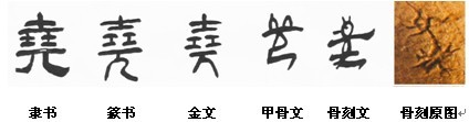 從骨刻文堯的形象到甲骨文“堯”字的造型也說明“堯”字就是一個簡化的老年人符號,頭部突出兩個大而有神的眼睛,身軀弓背,雙手下垂,跽坐。很明顯,甲骨文的“堯”字是從骨刻文的人物形象發展來的。“舜”的圖像與字形更為相似,兩只胳膊下垂,像個禿寶蓋兒,禿寶蓋兒上邊的大帽子像一撇,臉部像三個點,禿寶蓋兒下邊下肢與農具構成字的下半部。筆者認為,堯和舜的形象與史書描述、傳說都很接近,與書法和繪畫作品也很接近,而且“堯”字的造型與甲骨文基本相同,“舜”字也在金文中基本保持了頭戴平頂大帽的這一描述,其他甲骨文中也有近似的書寫方法。
