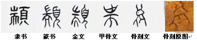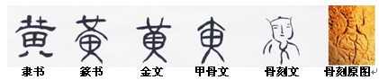 根據史書上對黃帝形象的描述,一種是握成發髻并橫插一簪,一種是頭戴冠巾。從甲骨文中的“炎黃”二字的寫法可以看出,二字是根據這一形象描寫而形成,只是“炎”后來不僅變瘦高了,而變成上下結構。“黃”字在甲骨文中繼承了骨刻文的四方臉型(國字臉型由此而來),隨著人們的審美變化到金篆字體中修正為上寬下窄型,而到了隸書中又回到了最初的四方臉型。國字臉型,這一稱謂人們說了幾千年,可誰能知道源于何人形象?當這幅“炎黃結盟”圖展現在我們眼前時這才恍然大悟,國字臉型竟由此而來!