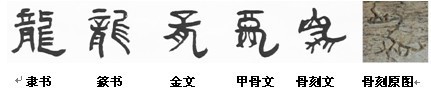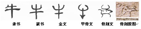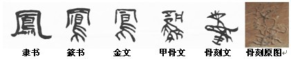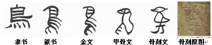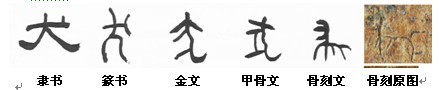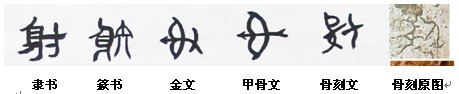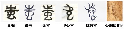 筆者認為,根據甲骨文向金文演變的某些規律,對于東夷骨刻文的破譯是非常有必要借鑒的。甲骨文向金文的過渡有幾種情況,一是從具有很強的圖畫性到脫離圖畫的符號化的演變;一是由繁到簡的演變;再就是完全照搬,筆畫相同,有的只是在書寫方法上略有變化。當然也有少量是由簡到繁的,這往往是形聲字演變的結果,有的增加了形旁或聲旁,但基本上是萬變不離其宗,有規律可循的。而東夷骨刻文向甲骨文的演變也基本上存在這四種情況,只不過由圖畫性向符號化過渡更為明顯,由象形、指事、會意向形聲字轉變的還不多見。由于借鑒了這一規律,在劉教授破譯的八個字的基礎上,筆者一口氣又破譯了近百字。為了便于對照辨認,按照漢字發展和演變的順序,對這些破譯出的文字分別用骨刻文、甲骨文、金文、小篆和隸書的書體,以書法藝術的表現形式創作了幾幅題為“中國文字演變過程”的書法藝術作品,并在每字后附有骨刻原圖,今取其一,以供讀者參考鑒別。(如圖)