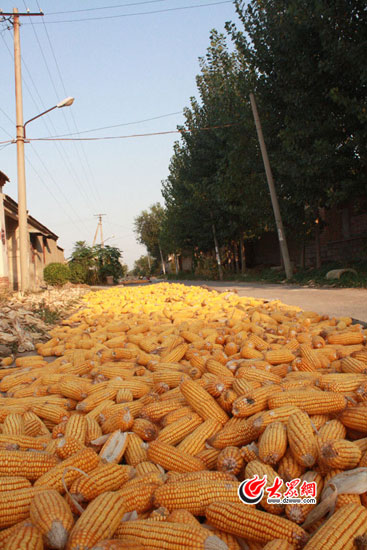 村民稱今年玉米獲得大豐收,圖為村民晾曬的新玉米。