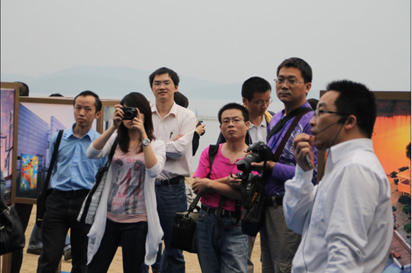 [提要] 22日下午,參加第三屆全國網絡媒體湖北行的全國30多家媒體記者在武漢集中采訪,在東湖疑海沙灘浴場參觀了武漢華僑城的品牌展示。