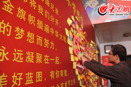 [提要] 山東黃金集團(tuán)藝術(shù)節(jié)暢想展板前,員工在將自己的暢想小貼紙粘貼在展板上,組成一個(gè)“心”