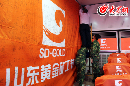 山東黃金集團的旗幟上,員工們的簽名或龍飛鳳舞、或絹美流暢,原本輕輕的旗幟也變得千斤重