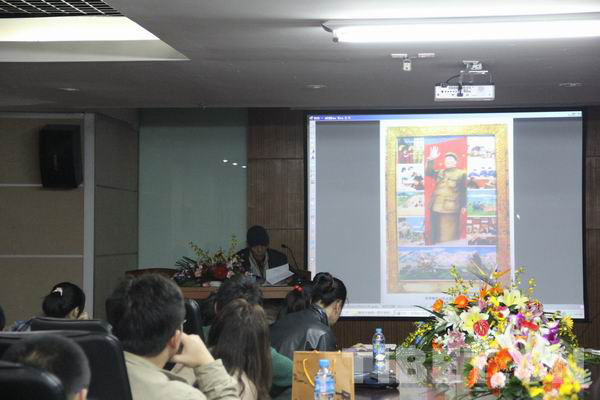 11月12日下午,在上海民族民俗民間文化博覽館的會議廳,西藏美協主席著名畫家韓書力正在作關于西藏當代美術的講座。此次講座為“和美西藏”美術作品展上海展的系列活動之一。