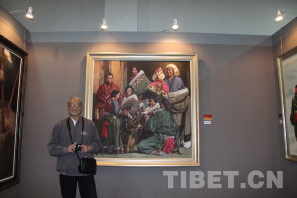 11月20日,首屆“和美西藏”美術(shù)作品展上海站的展館又迎來(lái)一個(gè)溫馨的周末。一大早,一位學(xué)者模樣的慈祥老人獨(dú)自緩步踱入展廳。這位老先生目光矍鑠,面色紅潤(rùn),花白的頭發(fā)整齊地梳向腦后,腰桿筆直,既有仙風(fēng)道骨之韻又給人一種鄰家阿伯的自然親切之感。