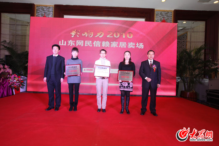 山東省室內(nèi)裝飾協(xié)會秘書長強健民(右一)、大眾網(wǎng)技術(shù)總監(jiān)李雪修(左一)為獲“山東網(wǎng)民信賴家居賣場”獎單位頒獎