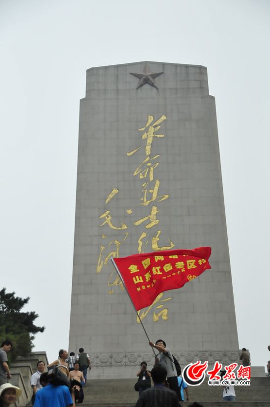 圖為采訪團記者在革命烈士紀念碑揮舞采訪團旗幟
