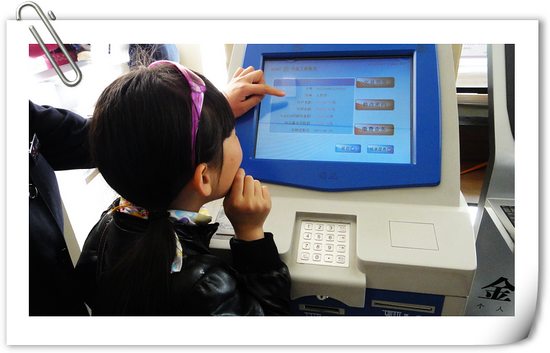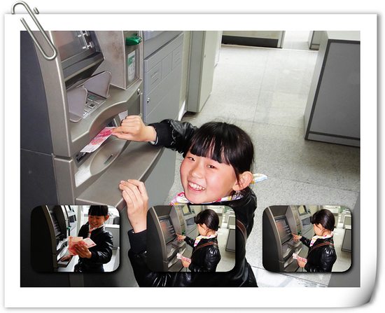 最小體驗者上佳表現之二:親手把錢從這大機器里取出來,拿到大鈔的感覺真爽呀。長這么大第一次取款,有紀念意義的時刻。