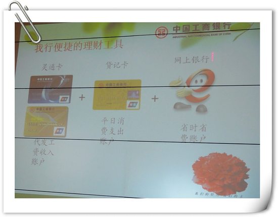 看到大眾媽網上發出活動公告,盡管今天上午閨女要學舞蹈,我還是沒猶豫就報了名。因為我們全家是工行的鐵桿用戶:我持有兩張工資卡外加一張信用卡,孩子爸也是三卡在手,我們家的房貸是工行的,我們家的電費也用工行的,我們家其他所有可以銀行交費的項目也都是工行的,對工行,就感覺象我們家的房和車一樣,是不可缺又特方便的一份子。