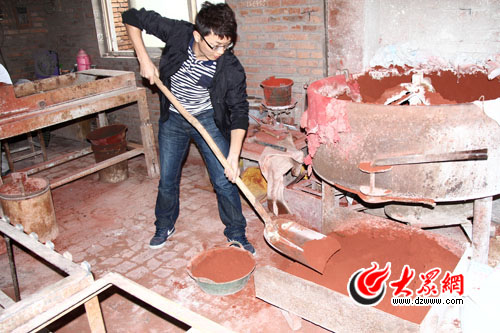 攪拌底料更是一項技術活兒了。攪拌機中泥沙滾滾,攪拌機外飛塵漫漫,記者們靠近一點就不自覺地閉眼遮面,好一會才適應過來。負責該環節的劉師傅說,底料的成分包括了細砂、白水泥和氧化鐵紅。其中白水泥的作用起膠結作用,而我們熟悉的磚紅色則是氧化鐵紅的妙處所在了!包S色磚塊里面用的是氧化鐵黃,”他說:“制磚的關鍵在底料,而底料的關鍵在水量!奔铀坑绊懼ùu的濕度和黏度,更關系到道路是不是結實耐用。