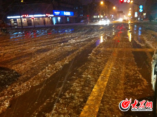 山大路與和平路路口的積雪已經(jīng)被碾壓為“冰水”。