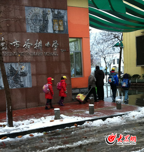 早上7:10,舜耕小學就有學生踏著濟南入冬第一場雪進入校園