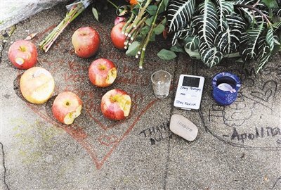 “果粉”擺上祭奠的蘋果,幾乎每一個都被咬掉一口。