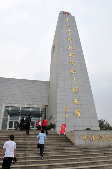 博物館的正面造型像是迎風招展的旗幟。右側的紀念碑,高度為31.117米,它的寓意為中華蘇維埃共和國成立于1931年11月7日。左側是一扇以花崗巖鑲嵌的636平方米巨型浮雕面,旗面內浮雕圖案主題為《人民共和國從這里走來》。