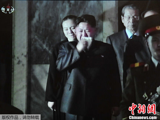 朝鮮中央電視臺的畫面顯示,金正恩當(dāng)天率領(lǐng)黨政軍領(lǐng)導(dǎo)人在金正日靈柩前長時間默哀,之后在靈柩旁守靈并接受各界群眾吊唁。在現(xiàn)場吊唁群眾的哭聲和哀樂聲中,金正恩淚流滿面,掏出手帕擦去眼淚。