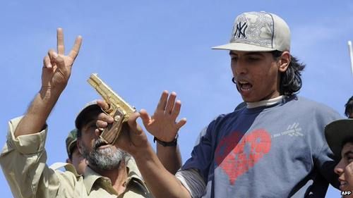 這個年輕人頭戴一頂棒球帽,手中揮舞著從卡扎菲身上取下來的金手槍,受到了周圍群眾的熱烈歡迎。