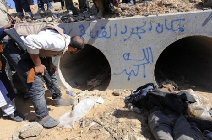 利比亞“過渡委員會”士兵正在向發(fā)現卡扎菲蹤跡的水泥管道中張望。在管道前,有一個政府軍士兵的尸體。