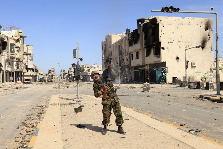 當地時間10月20日,利比亞執政當局士兵在蘇爾特街頭慶祝。