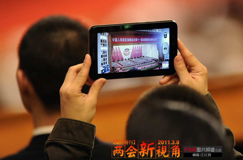 3月8日,全國政協(xié)十一屆四次會議第二次全體會議在人民大會堂舉行。圖為一名記者用平板手機拍攝會議。中新社記者 劉震 攝