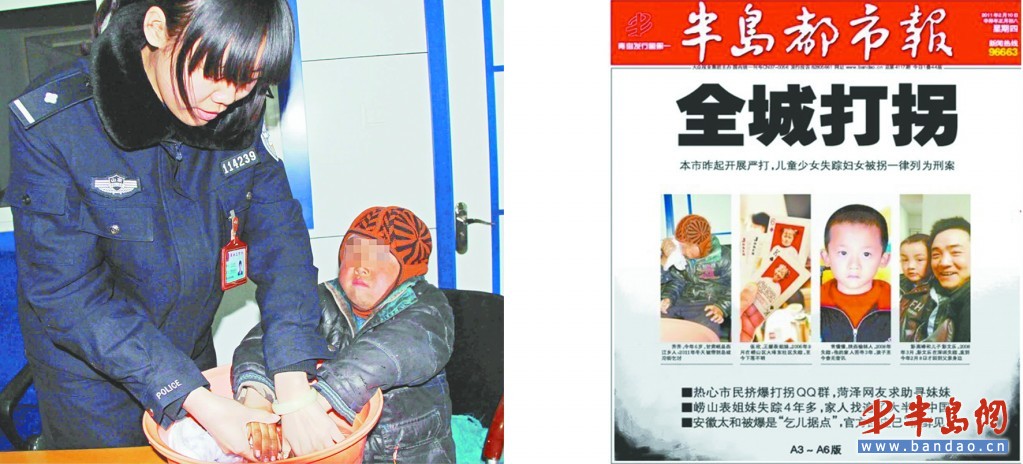 ▲ 島城警方在幫乞討兒童洗手洗臉 。( 資料圖片) ▲本報曾多次關注乞討兒童。