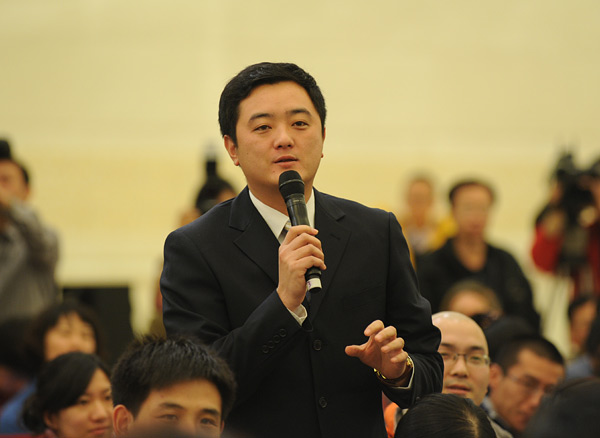 2011年3月4日11時,十一屆全國人大四次會議新聞發(fā)布會在人民大會堂三層金色大廳舉行,大會發(fā)言人介紹會議情況,并回答記者的提問。圖為中央電視臺和中國網(wǎng)絡(luò)電視臺記者提問。翟子赫 攝