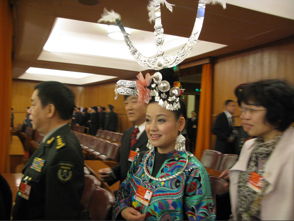 這位代表的頭飾還是第一次看到,是貴州的代表。