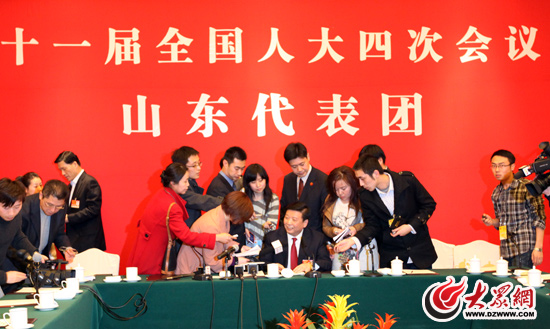 3月7日下午,參加十一屆全國人民代表大會第四次會議的山東代表團對媒體開放,吸引了75家中外媒體記者到場。此次對媒體開放的是山東團第二小組,省長姜大明也在這個小組參加審議。