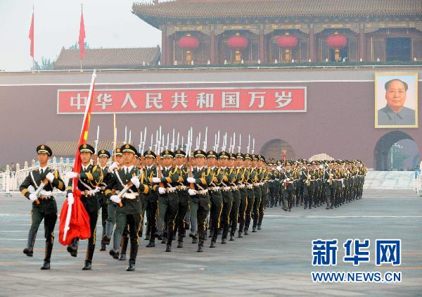 2010年10月1日清晨,國旗護衛隊走向天安門廣場。 新華社記者 唐召明攝