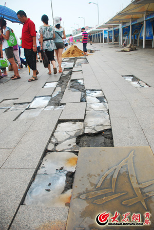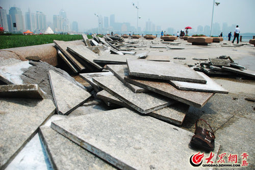 比起五四廣場,旁邊的音樂廣場可謂“深受重傷”,音樂廣場的沿海觀景道經(jīng)過一夜的沖擊變得坑洼不平,維修工人開始對道路進行修理。受傷最嚴重的是音樂廣場前靠海的地板磚。大面積的大理石地板磚被掀起,雖然經(jīng)過工人的整理,無數(shù)地板磚被堆砌在廣場南部綠化帶外,但不少碎石塊仍散落在綠化帶與廣場上。整個廣場滿目瘡痍,亂石散落各處,不少游客只能踩在零零的亂板石之上通過。