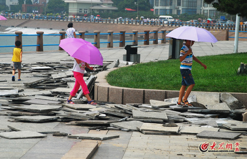 大眾網(wǎng)青島8月8日訊(記者 孫雯麗)在青島市人民政府防汛抗旱指揮部發(fā)布“解除全市防臺風二級 預警和應急響應”的通告后,青島前海景區(qū)也于今天上午按照正常營業(yè)時間陸續(xù)開放。今天上午,記者在五四廣場、音樂廣場的沿海一帶看到,受昨夜臺風“ 梅花”帶來的巨大海浪的影響,五四廣場海邊的護欄均有一定程度的損壞,音樂廣場受損較為嚴重,據(jù)估計有數(shù)百平米的地板磚被巨浪沖毀,相關單位正在緊張的對受災情況進行統(tǒng)計。