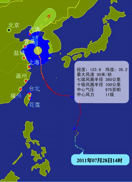 7日17時,“梅花”的中心位于青島市東南方向大約410公里的海面上,就是北緯33.8度,東經123.9度,近中心最大風力12級(33米/秒),中心氣壓970百帕。